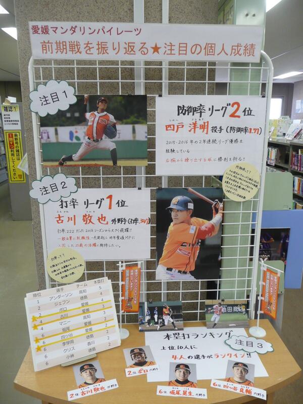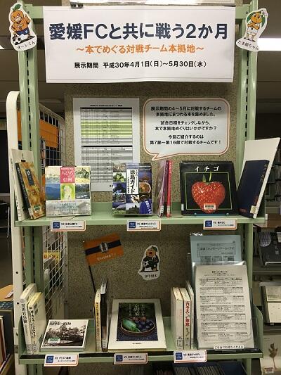 愛媛県立図書館は、展示期間の4月から5月に対戦する10チームの本拠地にまつわる本で各地をめぐります。