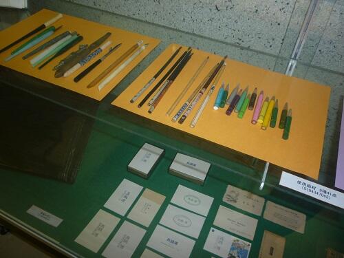 真鍋氏愛用の画材、似顔絵ゴム印、特製用箋・メモ用紙・封筒、名刺や、人柄の現れる日記、仕事メモなどを展示します。