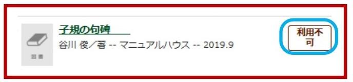 検索結果一覧画面で、「利用不可」と表示される資料は、工事中の図書館(堀之内)にあるため利用できません。
