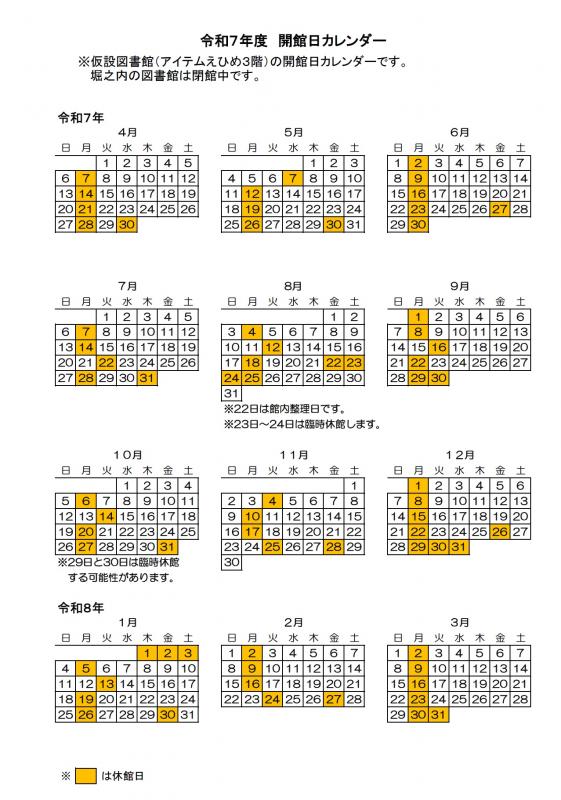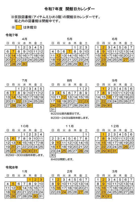 開館カレンダー 令和7年4月から令和8年3月まで